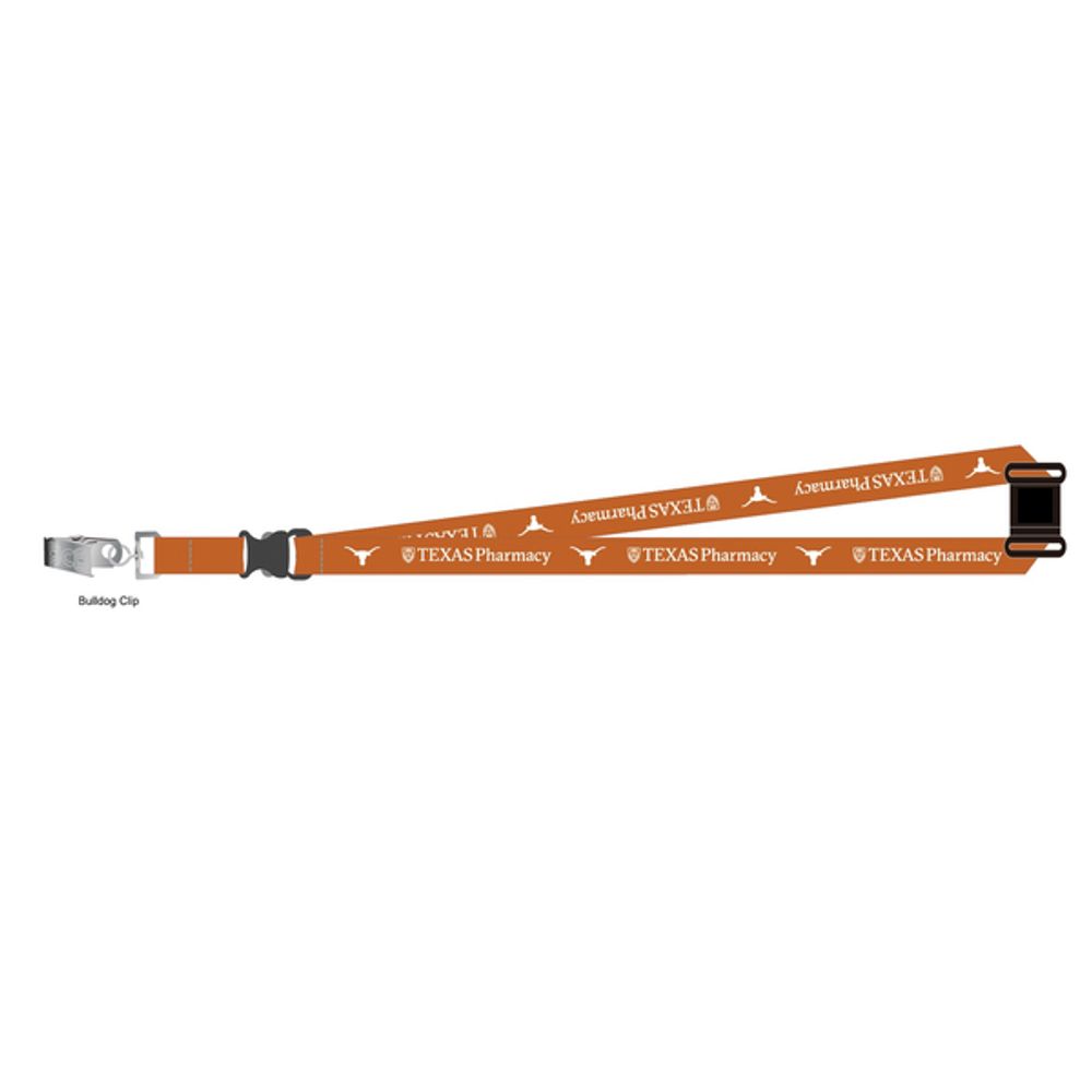 Show off your Texas Pharmacy pride while keeping your keys, ID or badge close at hand. This full-color lanyard features vibrant dye-sublimated graphics, a secure bulldog clip, and a safety breakaway.